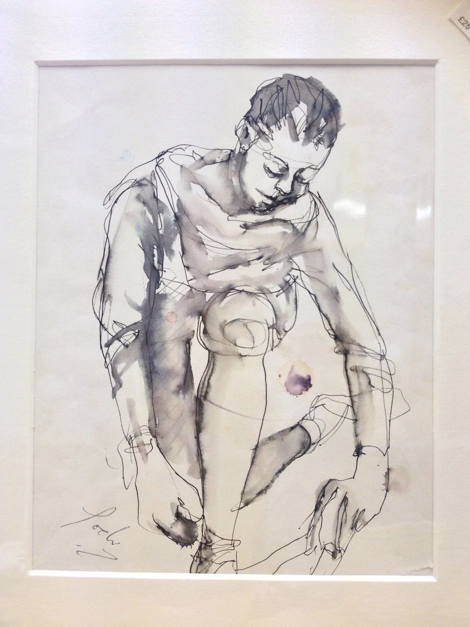 This is a sketch using burnt umber ink and pen on watercolour paper
