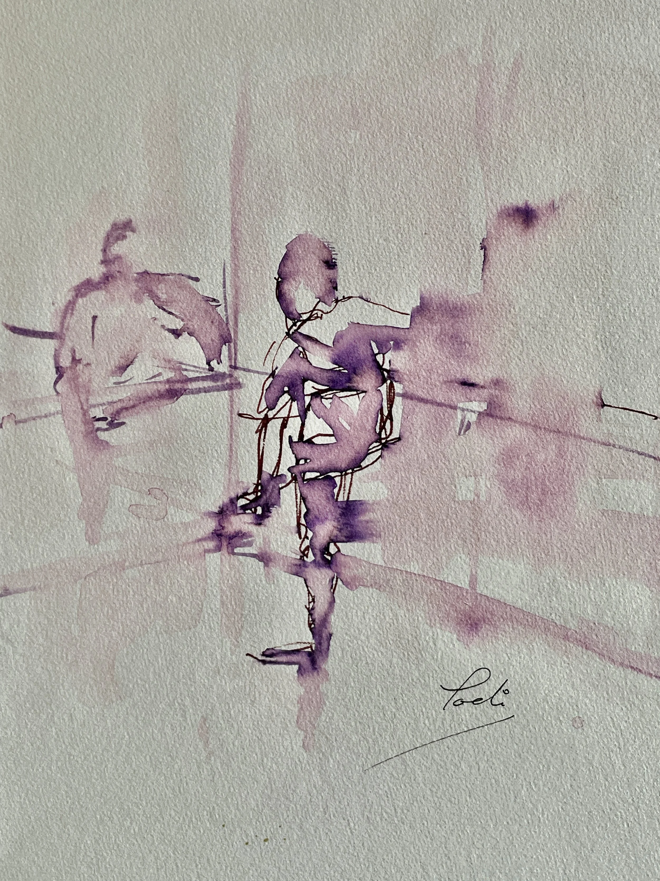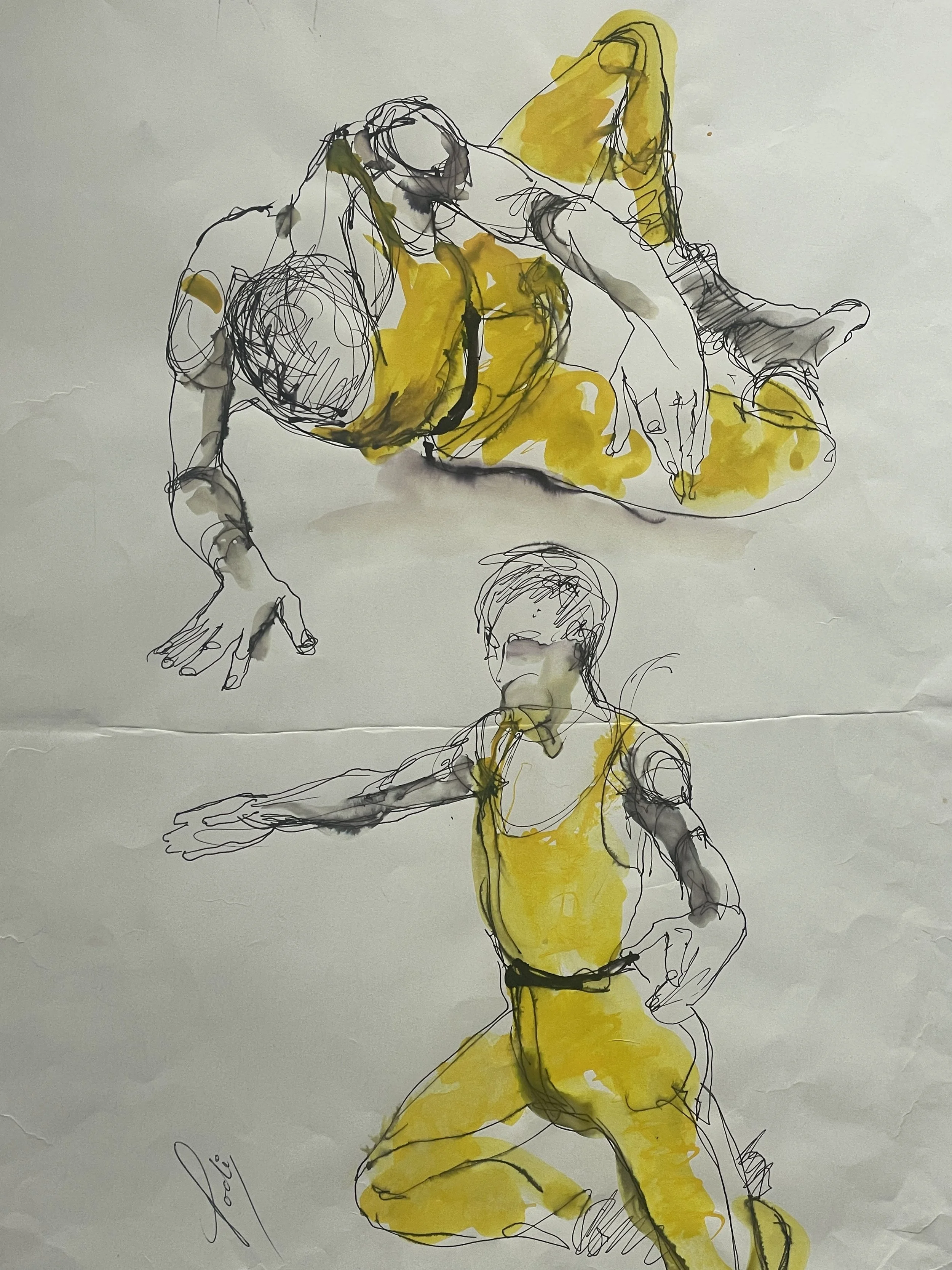 He held several poses for just a few seconds. It gave be enough time to sketch with a pen and added the colour later.