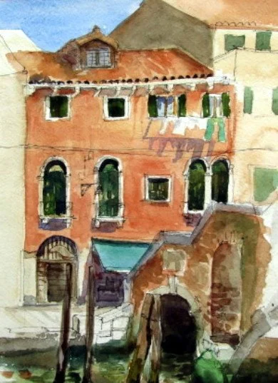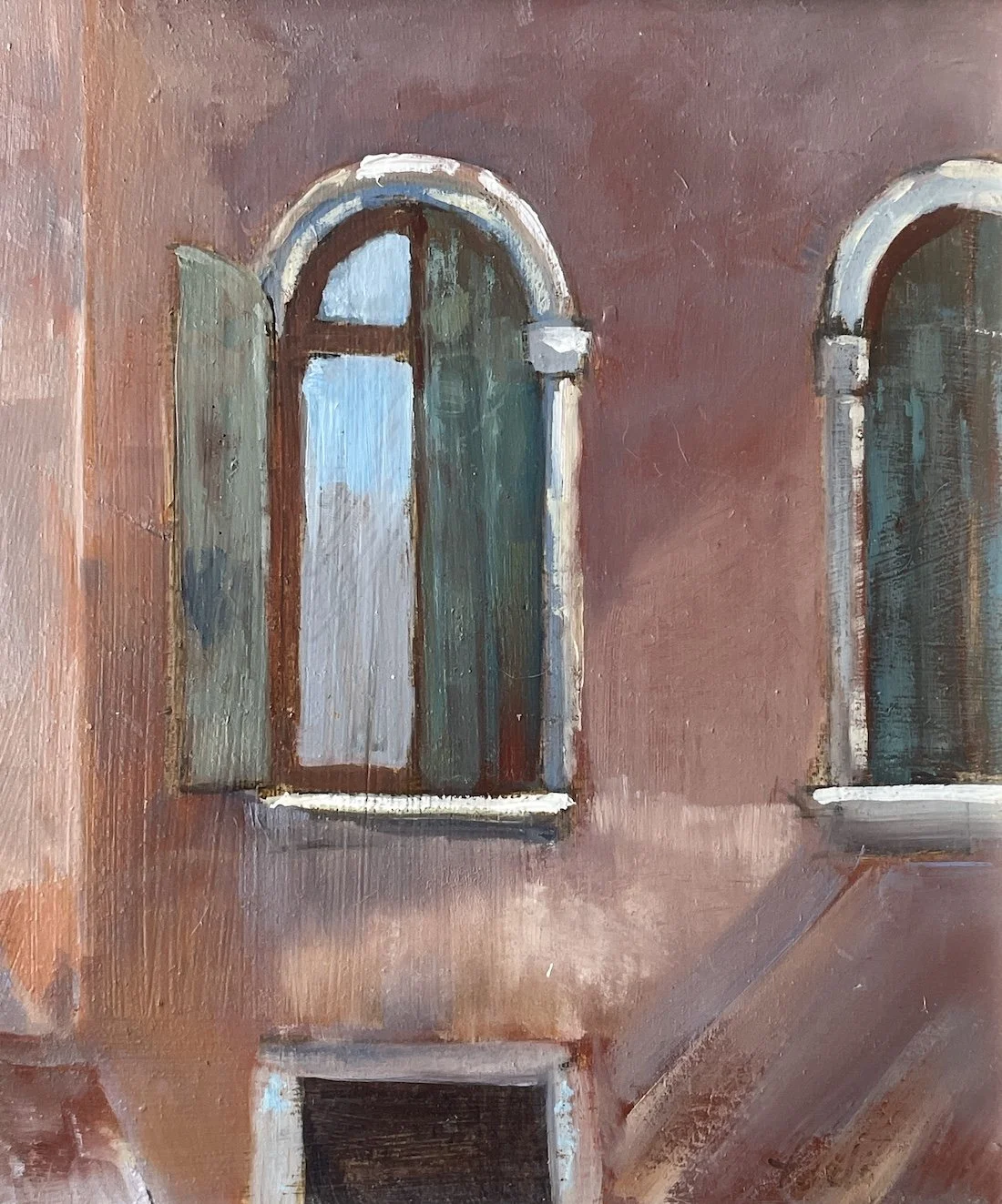 Small oil of some windows and a watercolour study paint4ed on site across a side canal.