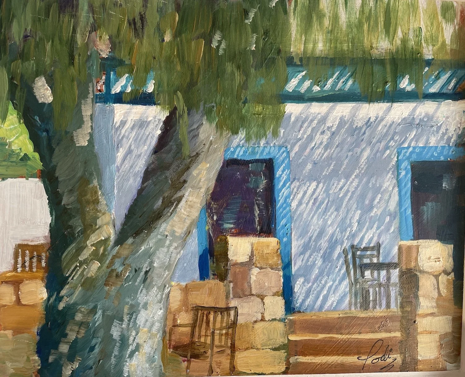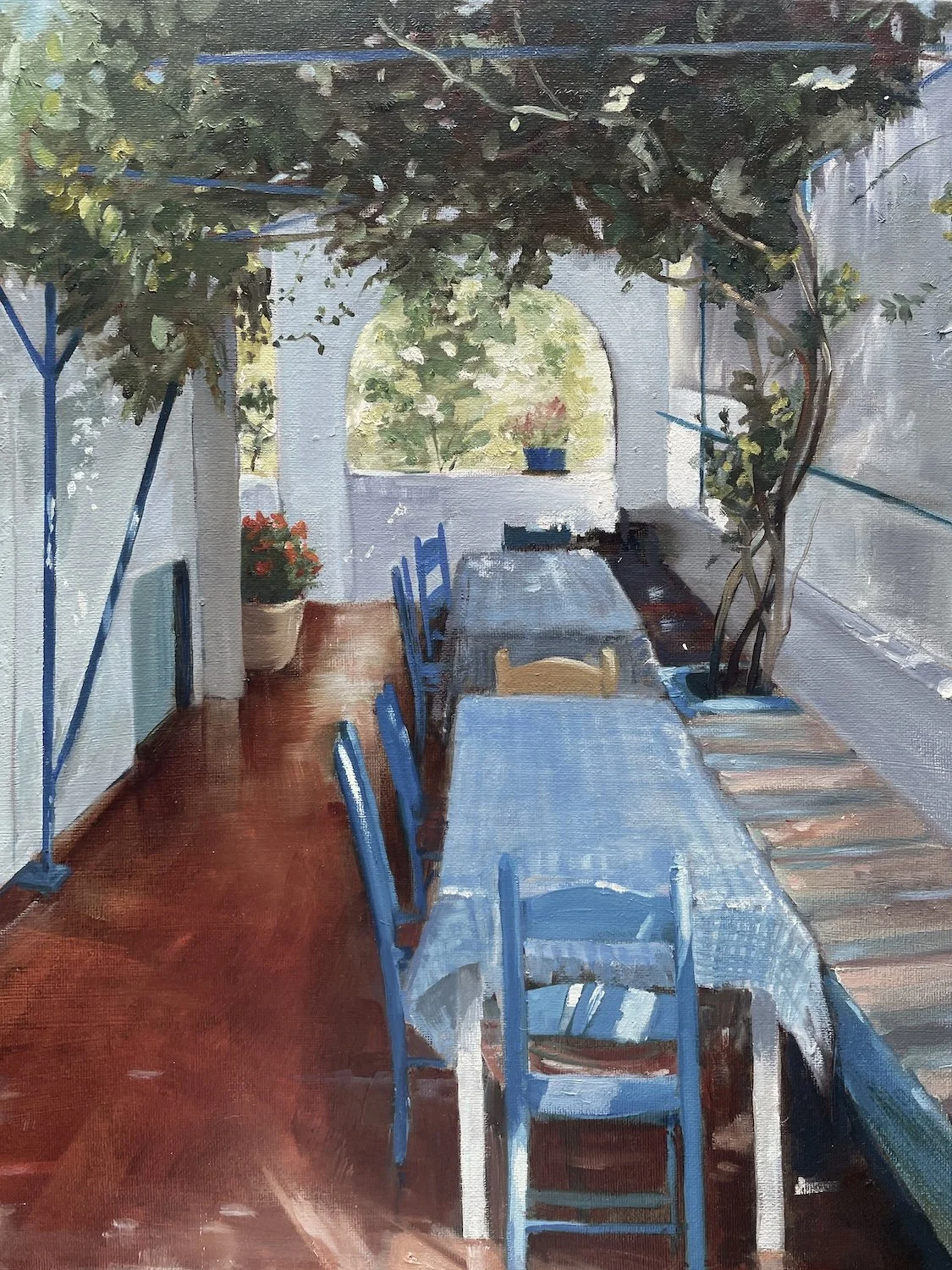 Restaurant on Telendos: Oil on canvas: 14” x 12” unframed. £350.00